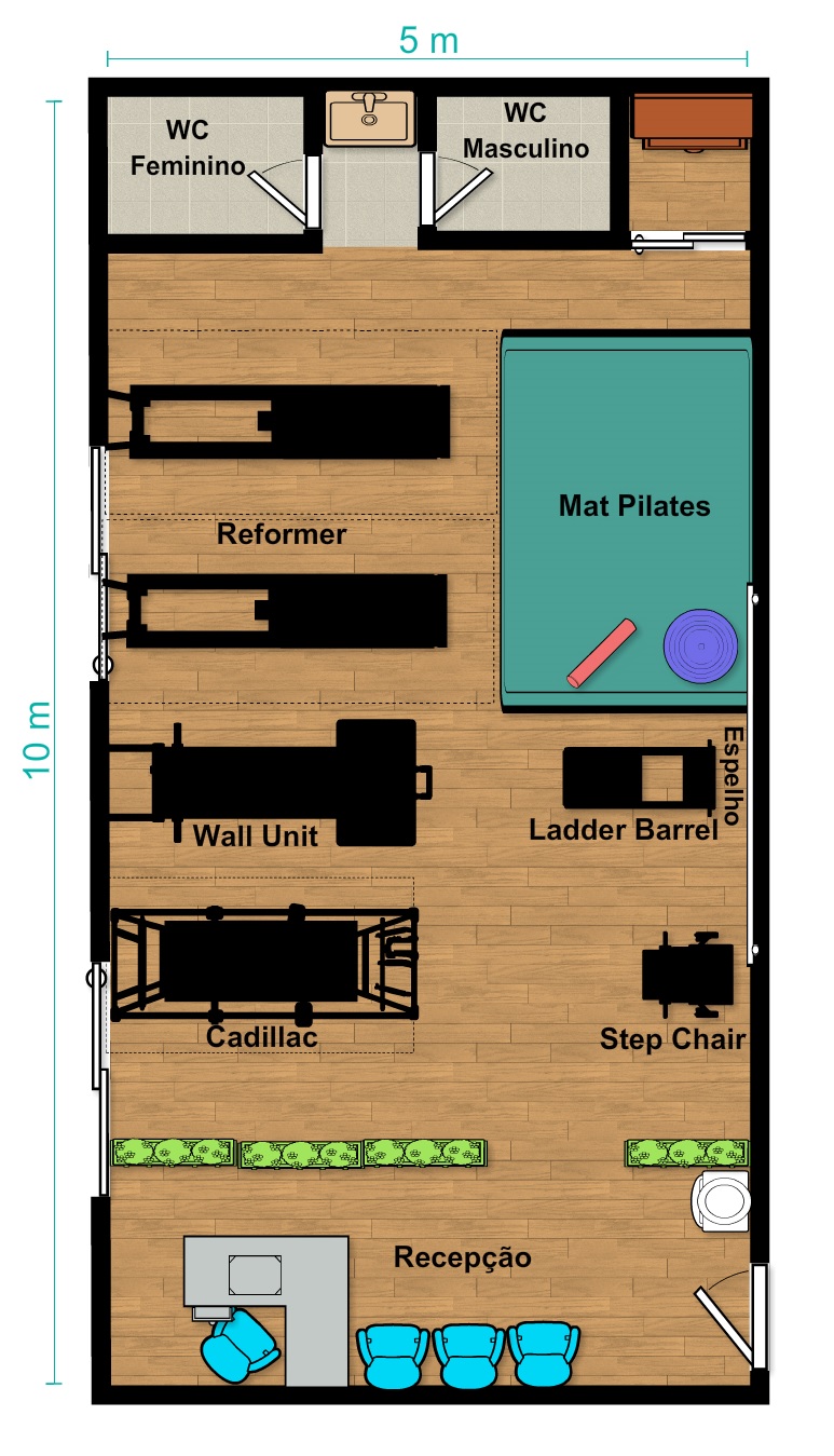 A planta baixa do studio, também chamada de layout, possibilita que você consiga visualizar a sala já com os equipamentos e móveis que utilizará. Ela permite que você tenha uma ideia que aparelhos de pilates o seu espaço comporta e qual é a disposição ideal para eles.