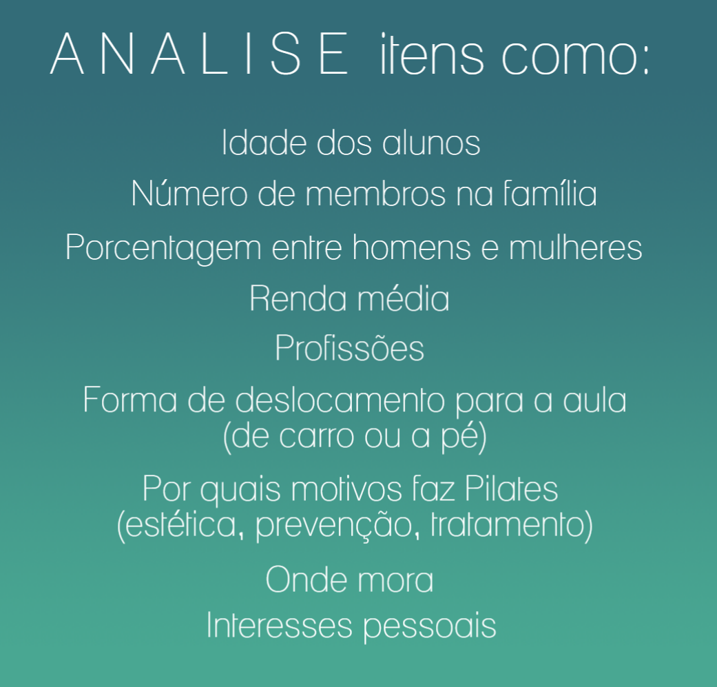 Esses são alguns exemplos que vão ajudar a direcionar as ações de marketing, descontos, promoções e campanhas, mas você pode questionar outros aspectos que tenham relevância para você.